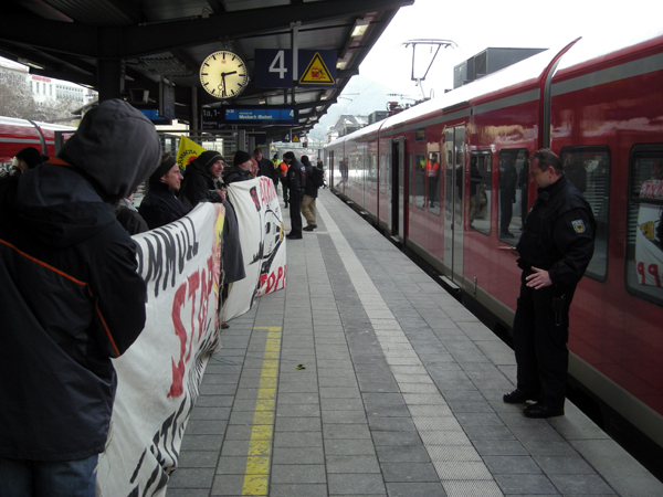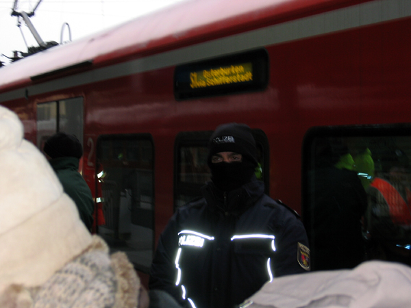 Trotz großer Ablehnung in der Bevölkerung, trotz vielfachen Widerstands gegen den Gorleben-Castor, gehen die Atommülltransporte gehen weiter. Am 15. Dezember rollte der Zug mit vier Castorbehältern aus dem südfranzösischen Atomforschungszentrum Cadarache in das Zwischenlager Lubmin in Mecklenburg-Vorpommern durch den Südwesten. Die hochradioaktiven Brennelemente kamen ursprünglich aus dem Kernforschungszentrum Karlsruhe, aus dem Karlsruher Versuchsreaktor KNK ('Schneller Brüter') sowie vom deutschen Forschungsschiff "Otto Hahn". Dieser Transport war erneut Ausdruck der unsinnigen, gefährlichen und verantwortungslosen alltäglichen Absurdität deutscher Atompolitik.